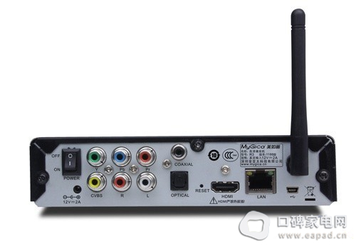 美如画R3第三代接口丰富,色差、AV、同轴、光纤、复位口、HDMI、有线RJ45端口、还有MINI USB TO PC的端口,可谓麻雀虽小、五脏俱全,满足用户日常观影需求。同时机身左侧面两排齐整的散热孔,散热极佳;而侧面的两个USB 2.0并排端口,可以外接U盘、读卡器、USB移动硬盘,而外置的SATA接口,可以外接2.5/3.5寸大容量硬盘,SATA光驱等,无需工具即可快速安装,为美如画R3的大容量数据的读取提供了最有效的保证。